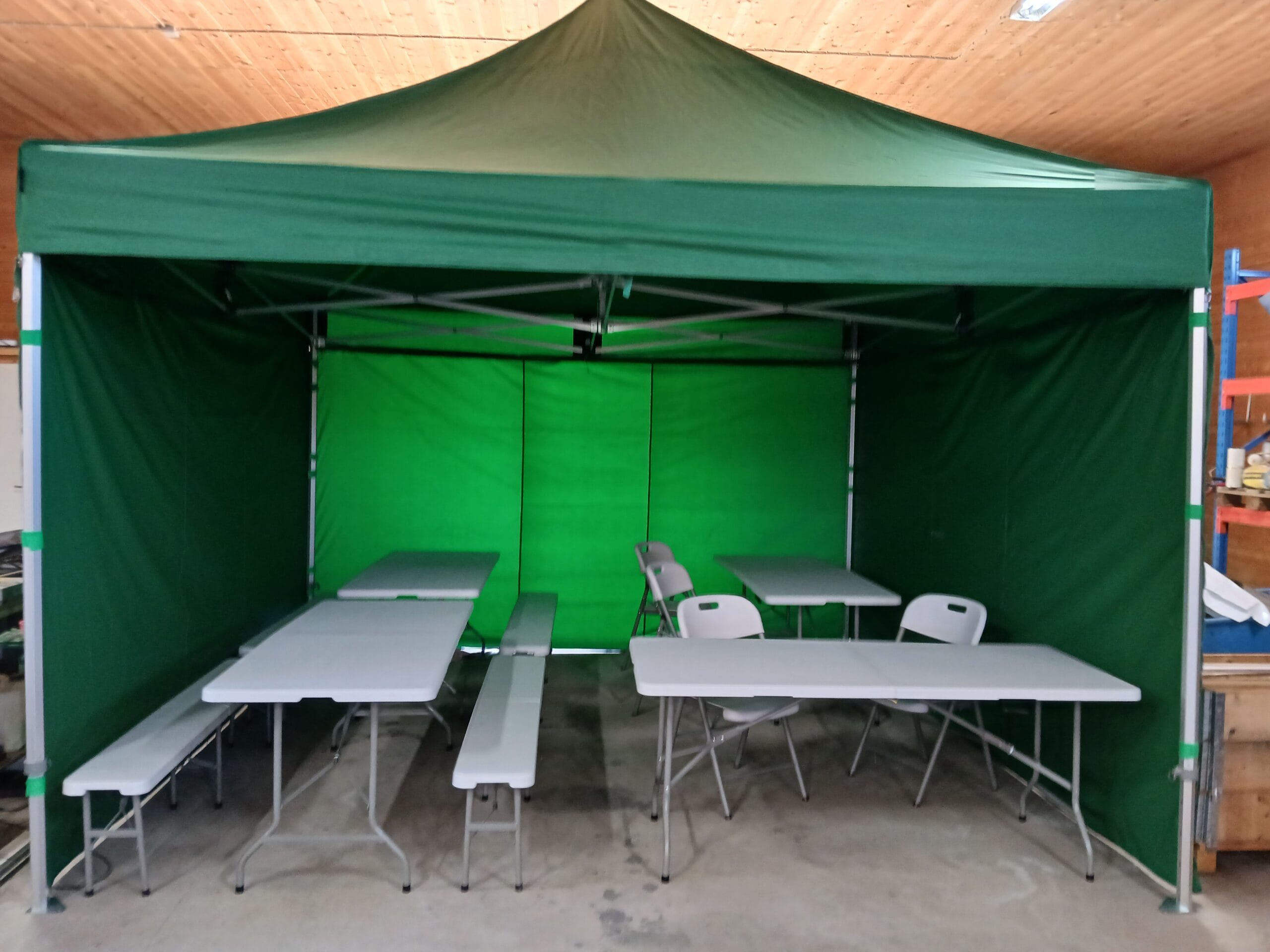 Myös kalusteita voi vuokrata: 4 pöytää, 4 penkkiä ja 4 tuolia vuokra 20 €/pv, seuraavat 10 €/pv.